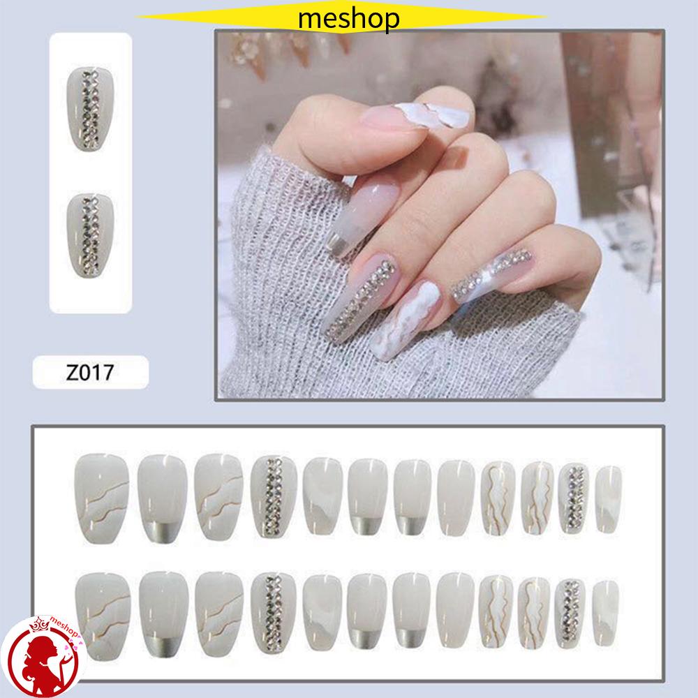 Me 24pcs New Fake Nails Rhinestone Design Long Coffin False Nail Tips Artificial With Hill Pattern Manicure Tools Milk White Full Cover Nail Accessories Shopee Singapore