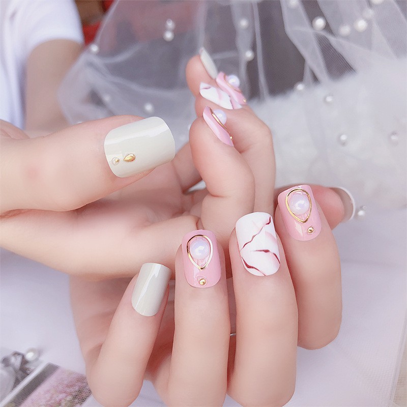 Cute Short Purple Crackle Fake Nails Pink White Mixed Artificial Nails With Pearls Pre Designed Nails Shopee Singapore