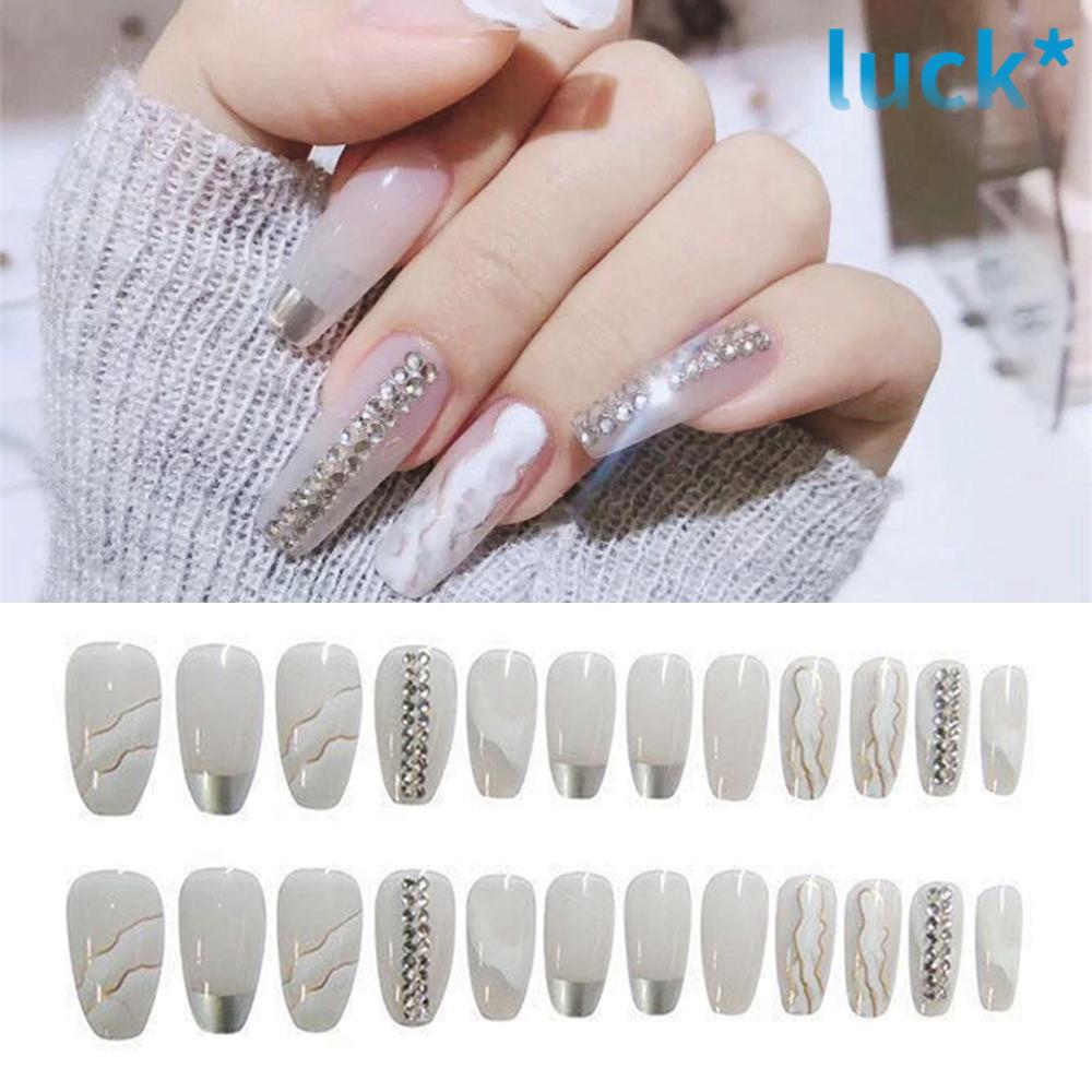Lucky 24pcs New False Nail Tips Milk White Nail Accessories Fake Nails Artificial With Hill Pattern Rhinestone Design Manicure Tools Full Cover Long Coffin Shopee Philippines